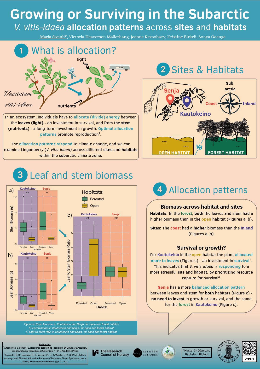 Growing or Surviving in the Subarctic – V. vitis-idaea allocation patterns across sites and habitats Posted on14/10/202524/11/2025AuthorfemjsLeave a comment Poster number: 299.1 Authors: Maria Steinli, Victoria Haaversen Møllerhaug, Jeanne Rezsohazy, Kristine Birkeli & Sonya Geange BIO299 - Fall 2025 Download as PDF