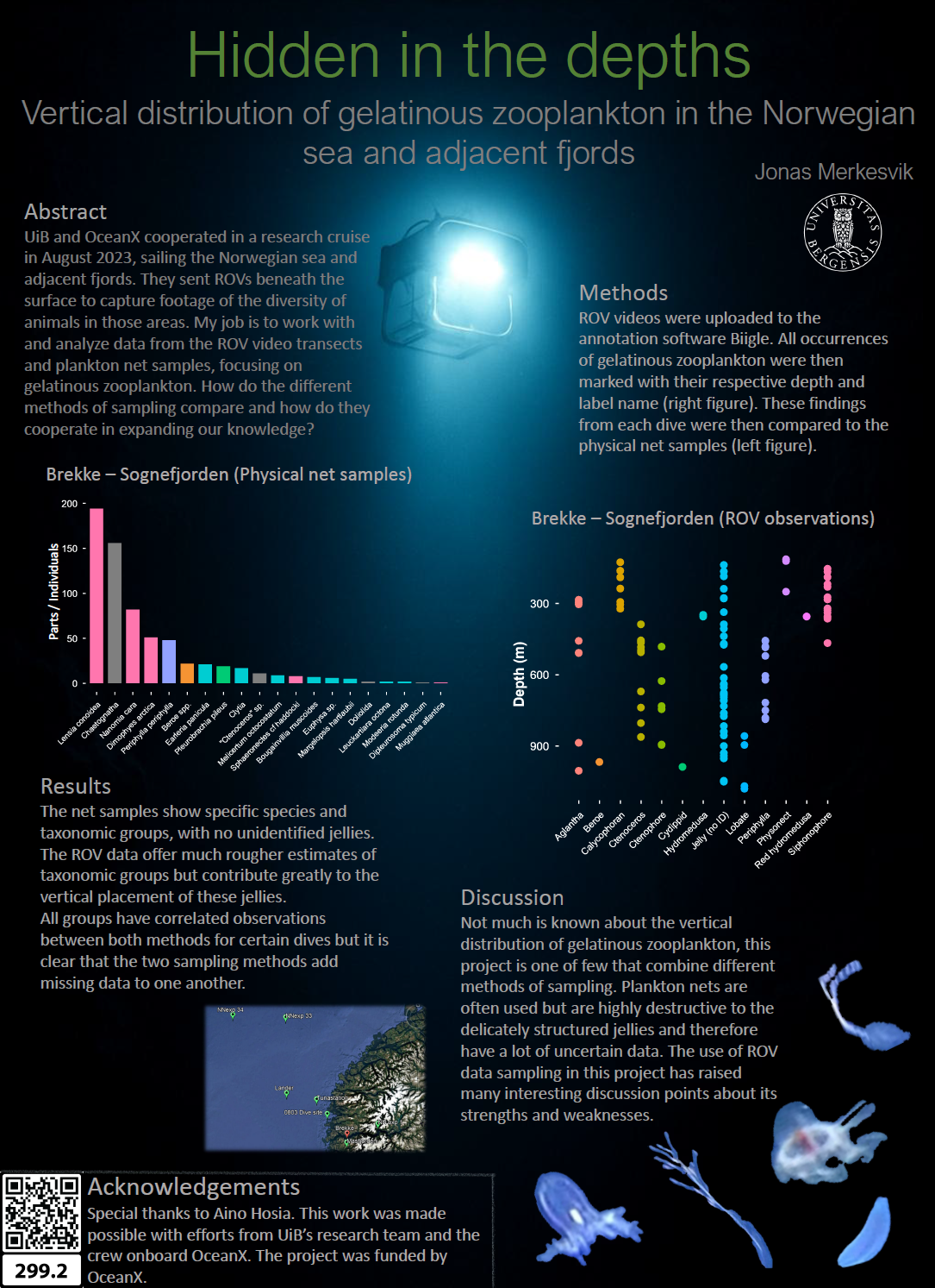Hidden in the depth – Vertical distribution of gelatinous zooplankton in the Norwegian sea and adjacent fjords Posted on14/10/202524/11/2025AuthorfemjsLeave a comment Poster number: 299.2 Authors: Jonas Merkesvik BIO299 - Fall 2025 Download as PDF