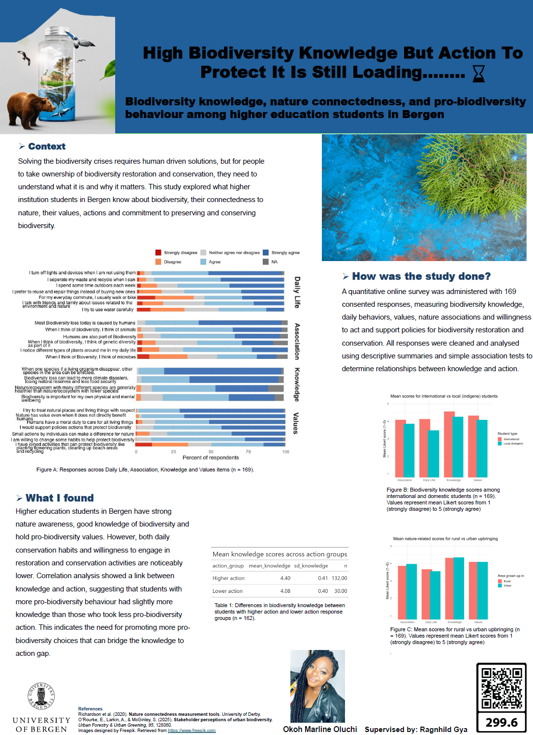 High Biodiversity Knowledge But Action To Protect It Is Still Loading…….. Posted on14/10/202524/11/2025AuthorfemjsLeave a comment Poster number: 299.6 Authors: Okoh Marline Oluchi & Ragnhild Gya BIO299 - Fall 2025 Download as PDF