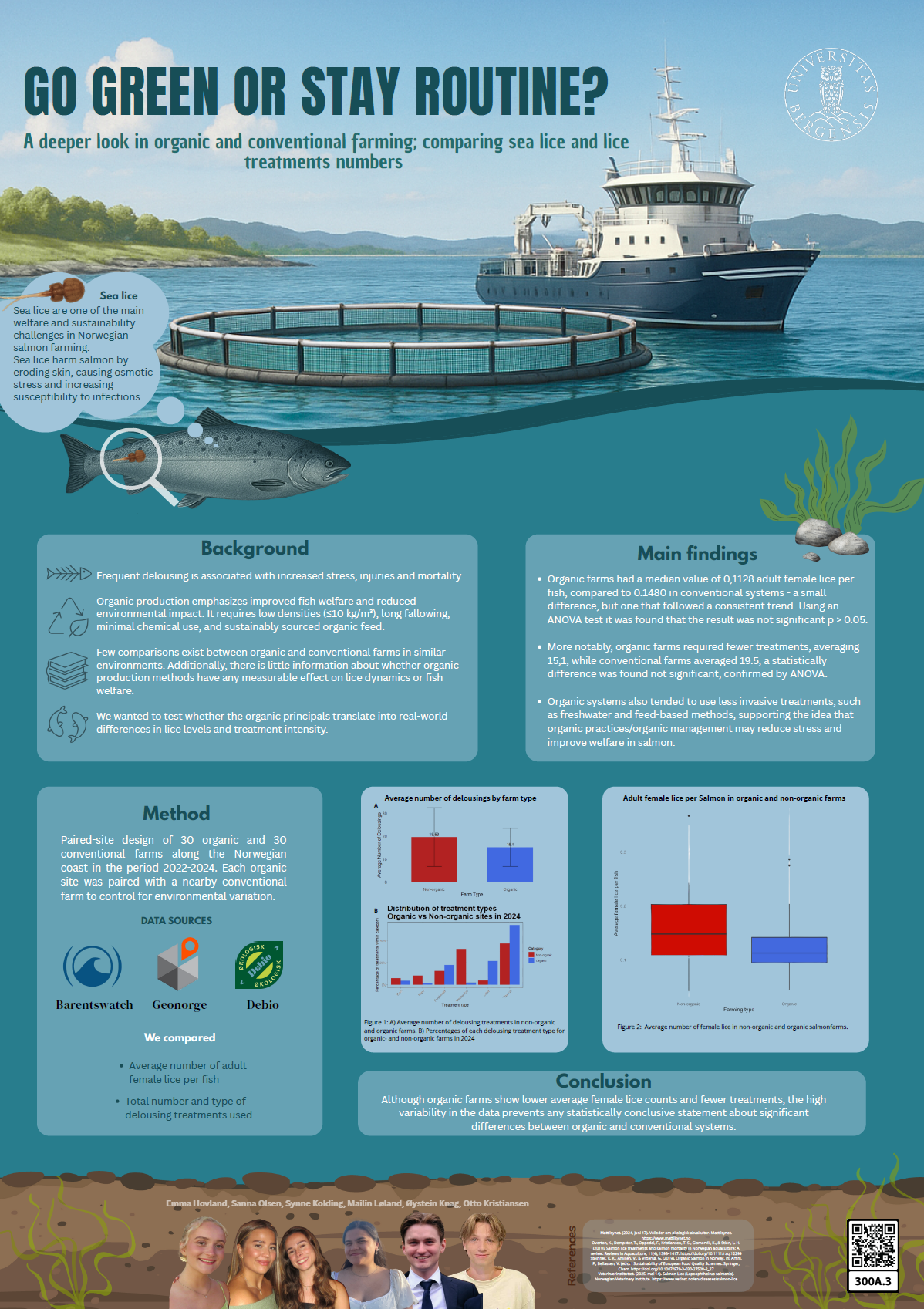 GO GREEN OR STAY ROUTINE? A deeper look in organic and conventional farming; comparing sea lice and lice treatments numbers Posted on21/10/202524/11/2025AuthorfemjsLeave a comment Poster number: 300A.3 Authors: Emma Hovland, Sanna Olsen, Synne Kolding, Mailin Løland, Øystein Knag & Otto Kristiansen BIO300A - Fall 2025 Download as PDF