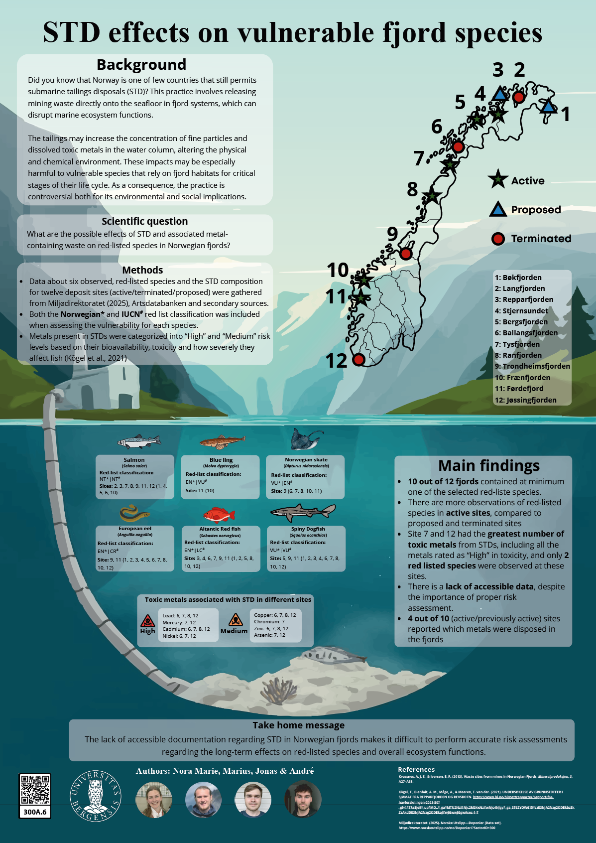 STD effects on vulnerable fjord species Posted on21/10/202524/11/2025AuthorfemjsLeave a comment Poster number: 300A.6 Authors: Nora Marie, Marius, Jonas & André BIO300A - Fall 2025 Download as PDF