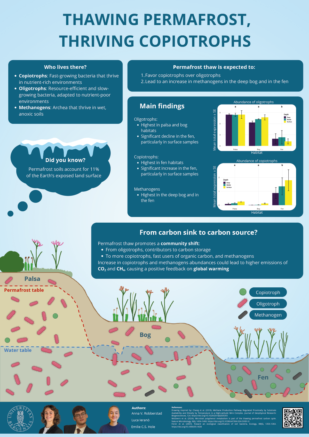 THAWING PERMAFROST, THRIVING COPIOTROPHS Posted on21/10/202524/11/2025AuthorfemjsLeave a comment Poster number: 300A.9 Authors: Anna V. Robberstad, Luca Ieranò & Emilie C.S. Hole BIO300A - Fall 2025 Download as PDF